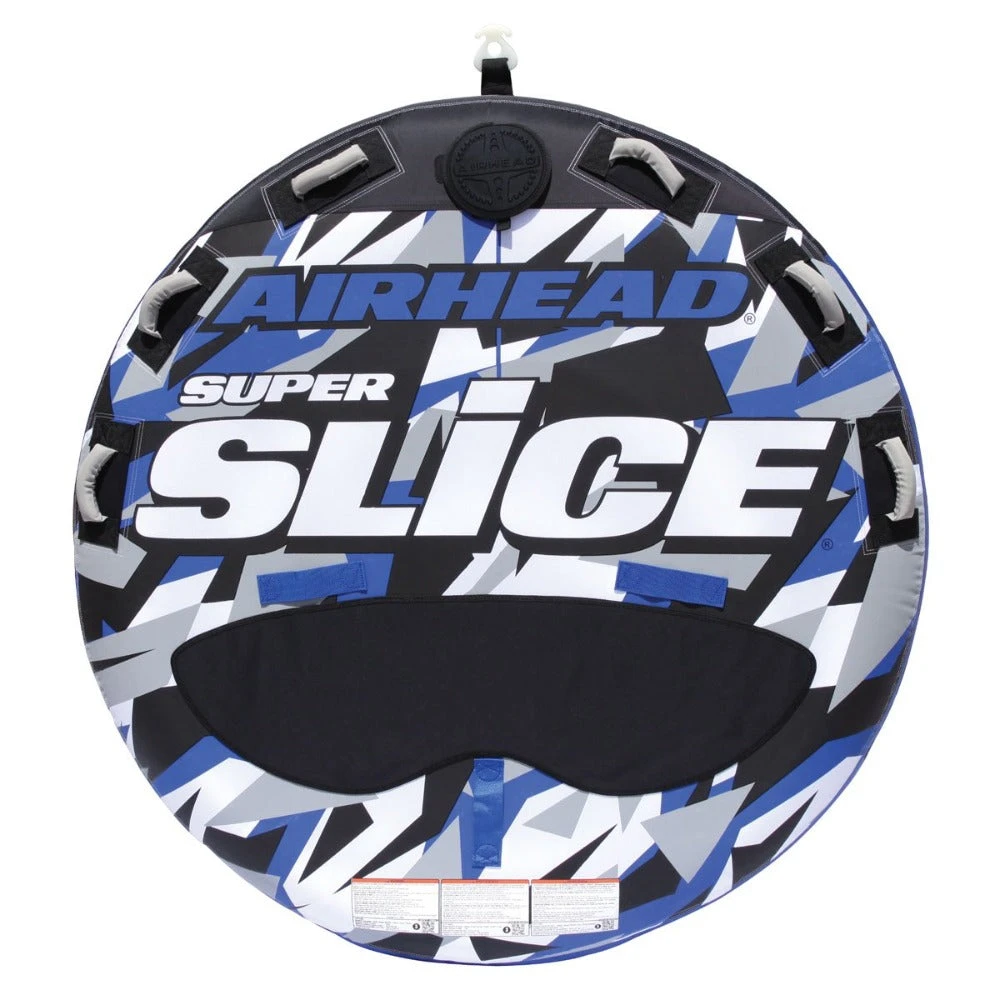 Gotta love AIRHEAD SUPER SLICE’s Cool Camo graphics! It’s one of top selling 3 rider towables of all time for good reason, it’s simply a better deck tube. We invented the tapered gusset design in 2000; thicker in front, thinner in back. The tapered gusset provides better towing characteristics, a more comfortable riding position and easy mounting from the water. SUPER SLICE’s nylon cover is manufactured from 100% 840 denier nylon, giving it twice the tear strength of many of our competitors’ deck tube covers. Peak performance is guaranteed with SUPER SLICE’s topside neoprene panel, 6 nylon-wrapped handles and neoprene knuckle guards. The durable 70” (deflated) 30-gauge virgin PVC bladder is fully encased by a double-stitched nylon cover with a reinforced internal tow harness. SUPER SLICE is equipped with a super-convenient Kwik-Connect for easy hook-ups and a patented Speed Safety Valve for fast inflating and deflating. Designed for 1 to 3 riders. Â