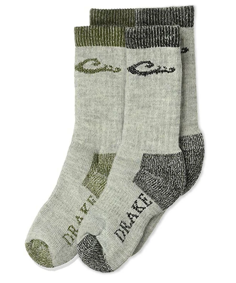 Drake little boy’s crew boot socks features premium merino wool acrylic blend, heavyweight knit, thermal warmth, moisture wicking properties, full cushion comfort, arch support, and stay-up leg. Green and black trim colors match camo gear and boots. Perfect for kids outdoor wear, family trips, hunting, hiking, trekking, camping, fishing, waterfowl, duck hunting, turkey hunting, sports, rucking, playing outside, and everyday.